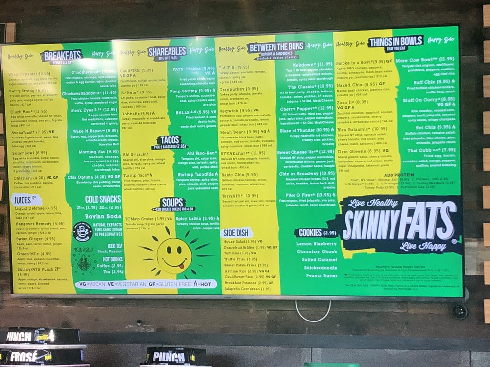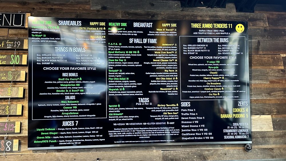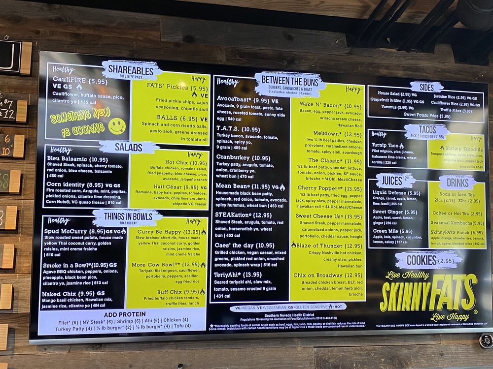 SkinnyFATS, located in Henderson, NV, offers a diverse menu catering to a variety of dietary preferences. With options for vegan, vegetarian, and gluten-sensitive diners, the restaurant provides a range of shareables, bowls, and breakfast items. Highlights include the CauliFIRE cauliflower dish and the Mangolorian protein bowl. Customers praise the friendly service and flavorful offerings, such as the bruleed grapefruit and the meltdown. The eatery also offers a unique dining experience with swinging seats on the patio and a chill vibe indoors. Despite some minor issues with availability of certain items, SkinnyFATS remains a popular choice for those looking to balance indulgence and health in their dining choices.