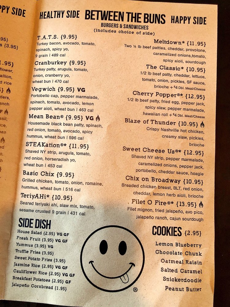 #LiveHappy - choice of protein, cheddar, tomato, onion, pickle, lettuce, & sf sauce on Potato Bun**Base Allergens: wheat, cow's milkPhoto w/ Smashed Patty **Further allergens dependent on protein choice
